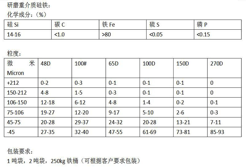 重介质硅铁是一种应用广泛,专门冶炼而成的硅铁合金,具有耐氧化,硬度大,带强磁性等特点,使用后经过筛分和磁选回收,可以返加再利用,因此,使用重介质硅铁的话,有利用降低生产成本。硅铁中含硅量小于13%时,韧性增加,给磨碎制备带来困难,而且在水中易于氧化;当含硅量超过18%时,磁选性减弱不便回收。故以含硅13%-18%,含铁87%-82%的硅铁适合使用,冶炼成块的硅铁需要经过粉碎,研磨后才使用。