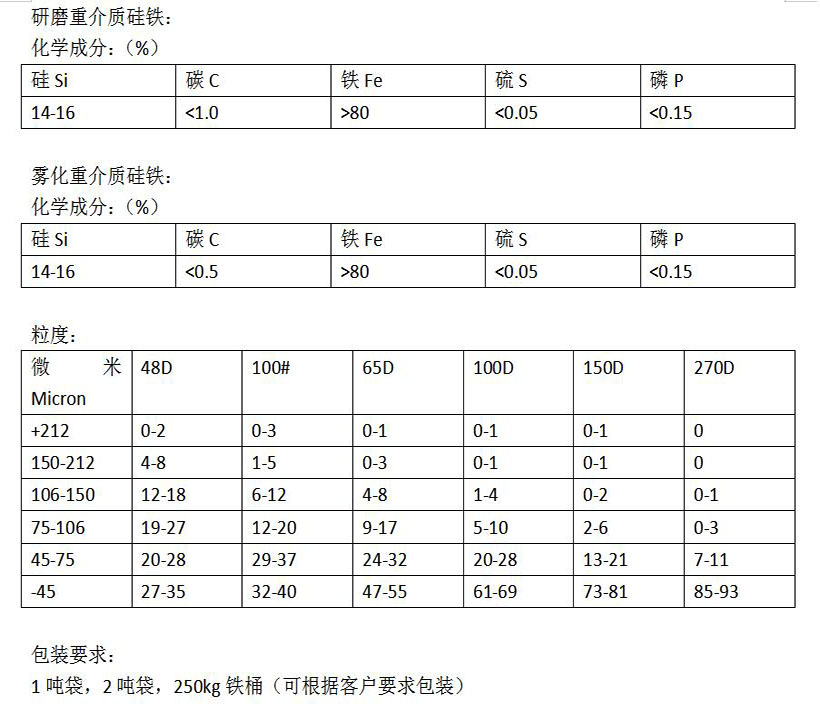 重介质硅铁是一种应用广泛,专门冶炼而成的硅铁合金,具有耐氧化,硬度大,带强磁性等特点,使用后经过筛分和磁选回收,可以返加再利用,因此,使用重介质硅铁的话,有利用降低生产成本。硅铁中含硅量小于13%时,韧性增加,给磨碎制备带来困难,而且在水中易于氧化;当含硅量超过18%时,磁选性减弱不便回收。故以含硅13%-18%,含铁87%-82%的硅铁适合使用,冶炼成块的硅铁需要经过粉碎,研磨后才使用。